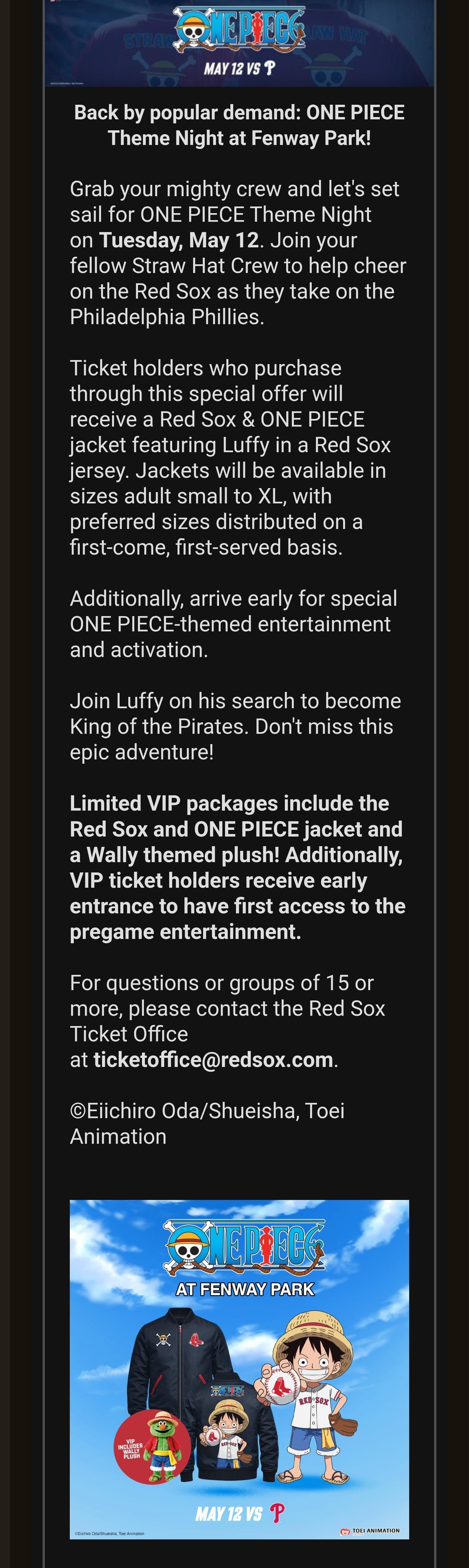 One Piece night is back! 3 comments They should have a JJBA night since Steel Ball Run is coming out. I know they wont, but a Johnny bobblehead in a red sox jersey would go hard Glad I went to last year’s. The jersey is way cooler than this jacket. Awesome, can’t wait!!! Leave a ReplyYou must be logged in to post a comment.