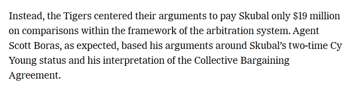 [Stavenhagen] Tigers centered their arguments to pay Skubal only $19 million on comparisons within the framework of the arbitration system. Agent Scott Boras, as expected, based his arguments around Skubal’s two-time Cy Young status and his interpretation of the Collective Bargaining Agreement