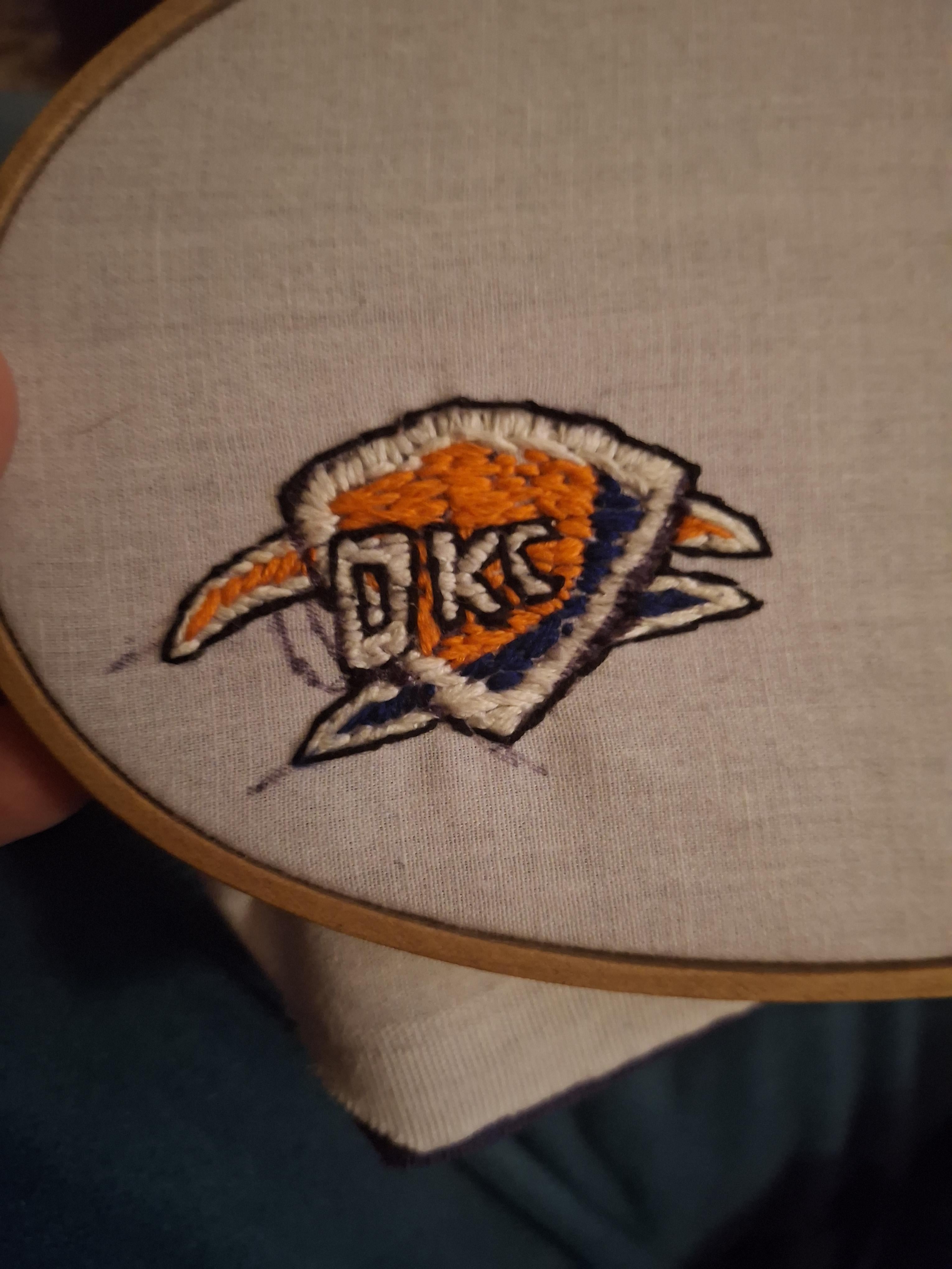 The first one was straight onto my shorts. I have an embroidery hoop that I'm going to just be making several of these with some differences. I want the OKC part a little more to the left so the K and the C could be bigger. I'm not sure. Thoughts welcome.
