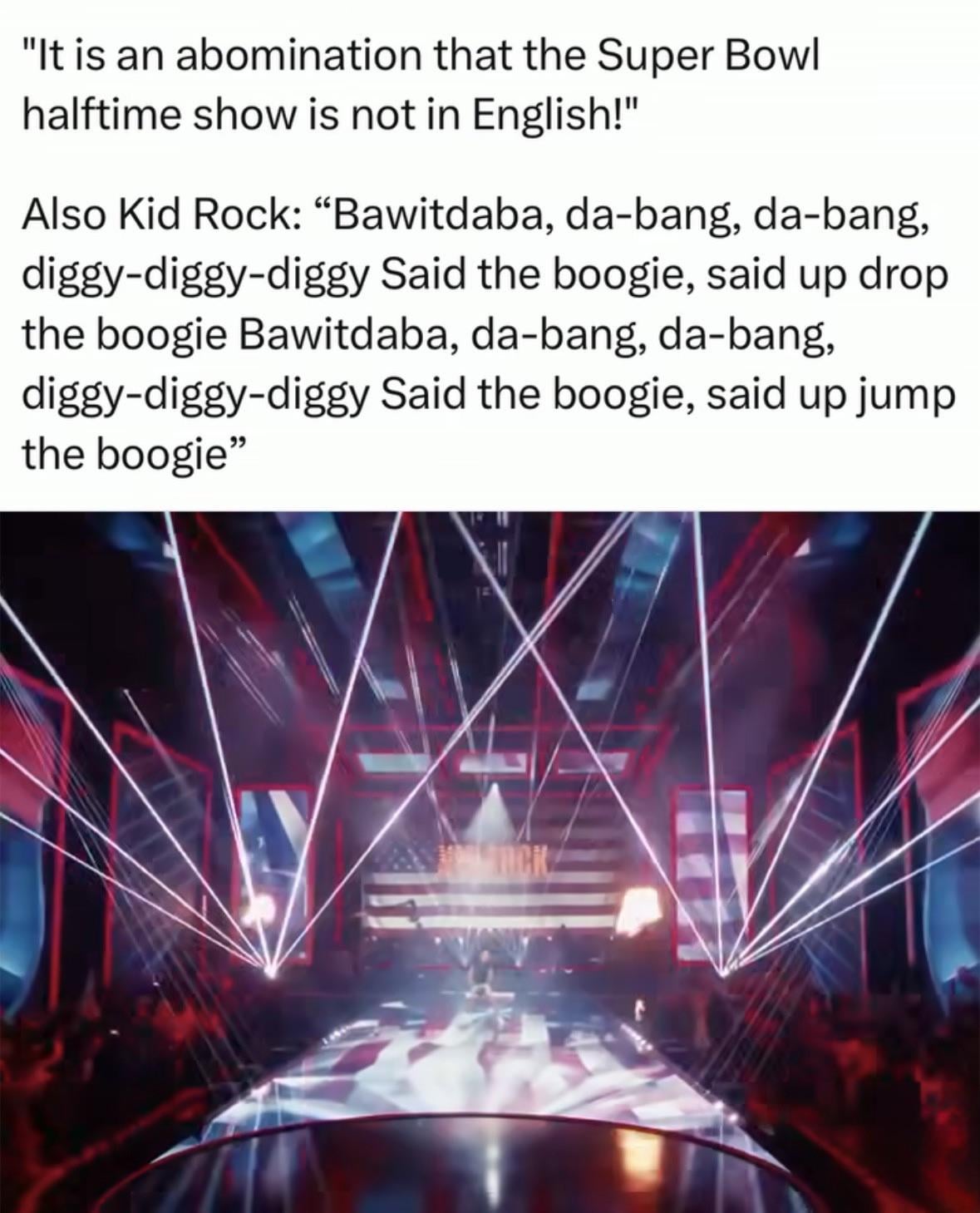 Situations like this really do confirm most of this site is 12 year-olds and Chinese bots. Shitty halftime shows by momentarily “hot” performers is nothing new. You dweebs aren’t owning MAGA or making a difference, it’s another musical act everyone who actually watches football ignores if they’re mentally over the age of 25. Nobody really cares what language this dude mumble raps in, and we’ll never have to see him again.
