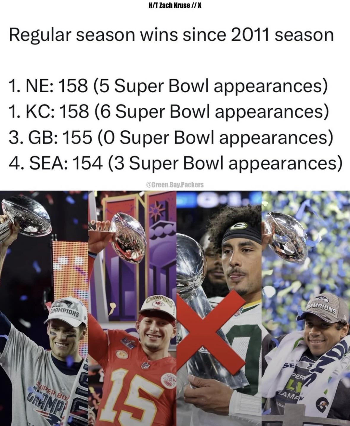 4. Add 1 season to that and the packers have a super bowl. Add 15 years and the packers will have another and the pats will have 2 more. Only counting 2025 season, the seahawks are the only team to win a superbowl. See how stupid that sounds?