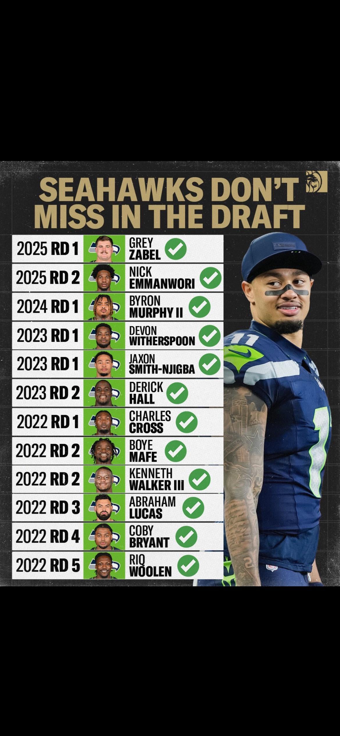 Not taking anything away from Seattle, and not excusing picks like Elam, but it should be pointed out that the Seahawks picks were much higher than Buffalo’s in those drafts: 9, 5, 16, and 18th overall, compared to the Bills 23, 25, 28 (traded to 33), and 30, with some extra first and seconds mixed in from the Wilson trade.