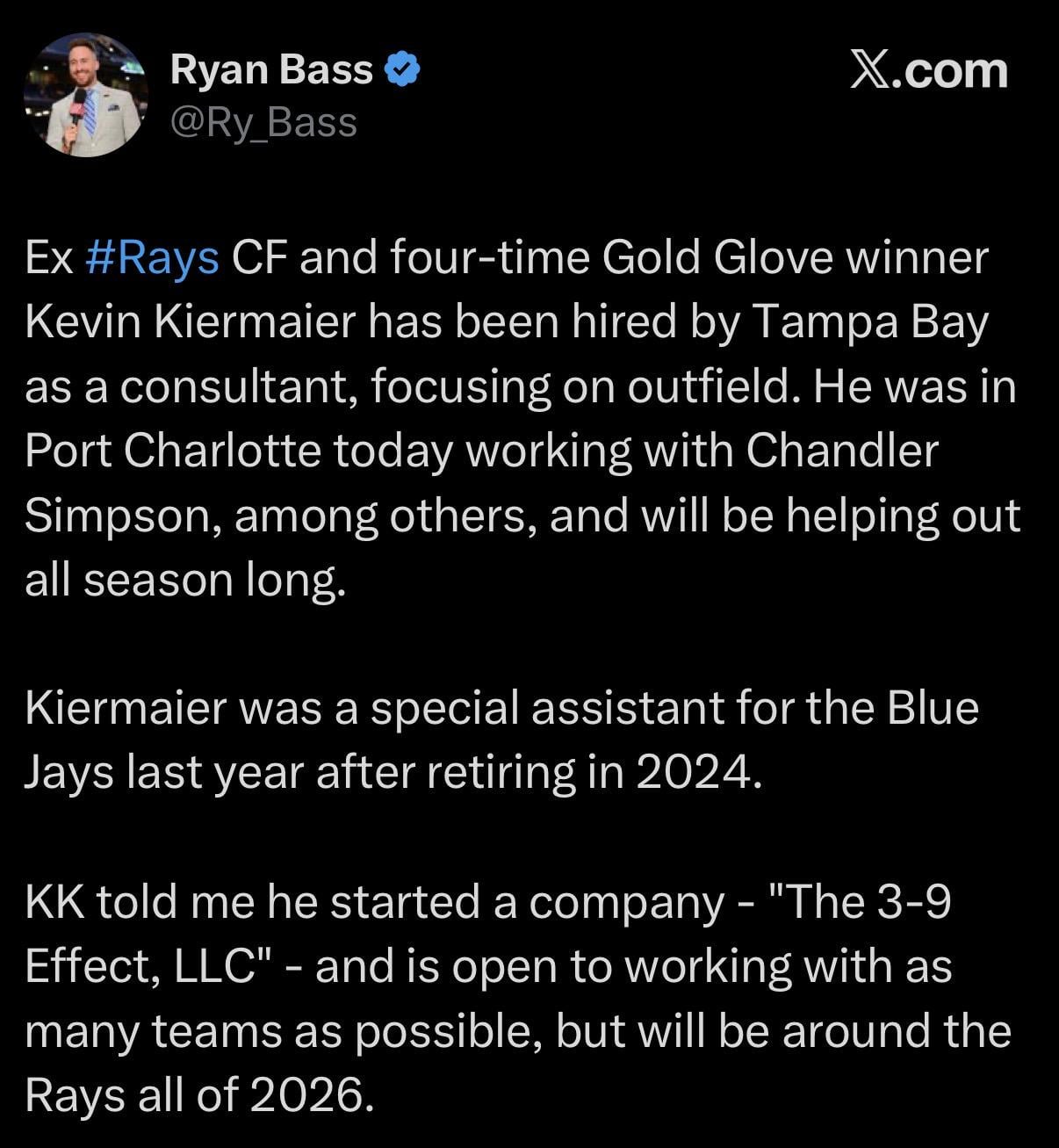 [Bass] Kevin Kiermaier has been hired by Tampa Bay as a consultant, focusing on outfield. Today he was working with Chandler Simpson, among others, and will be helping out all season long. Kiermaier was a special assistant for the Blue Jays last year after retiring in 2024.