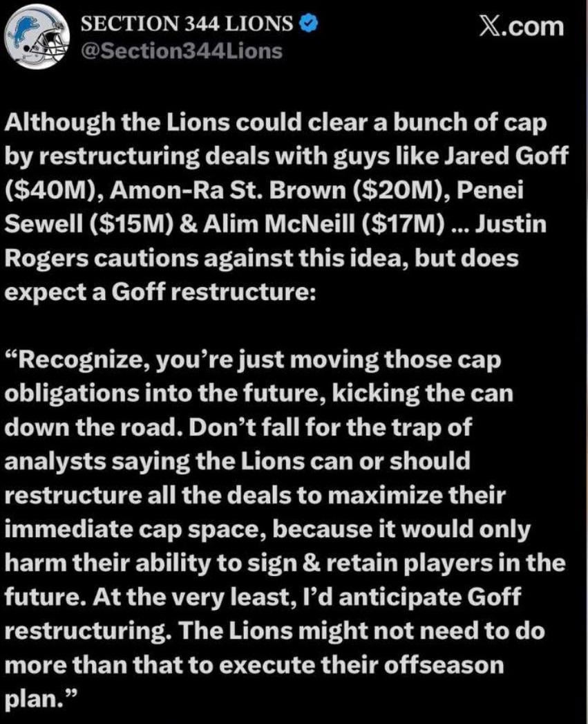 "Recognize, you're just moving those cap obligations into the future, kicking the can down the road. Don't fall for the trap of analysts saying the Lions can or should restructure all the deals to maximize their immediate cap space, because it would only harm their ability to sign & retain players in the future. At the very least, l'd anticipate Goff restructuring. The Lions might not need to do more than that to execute their offseason plan."