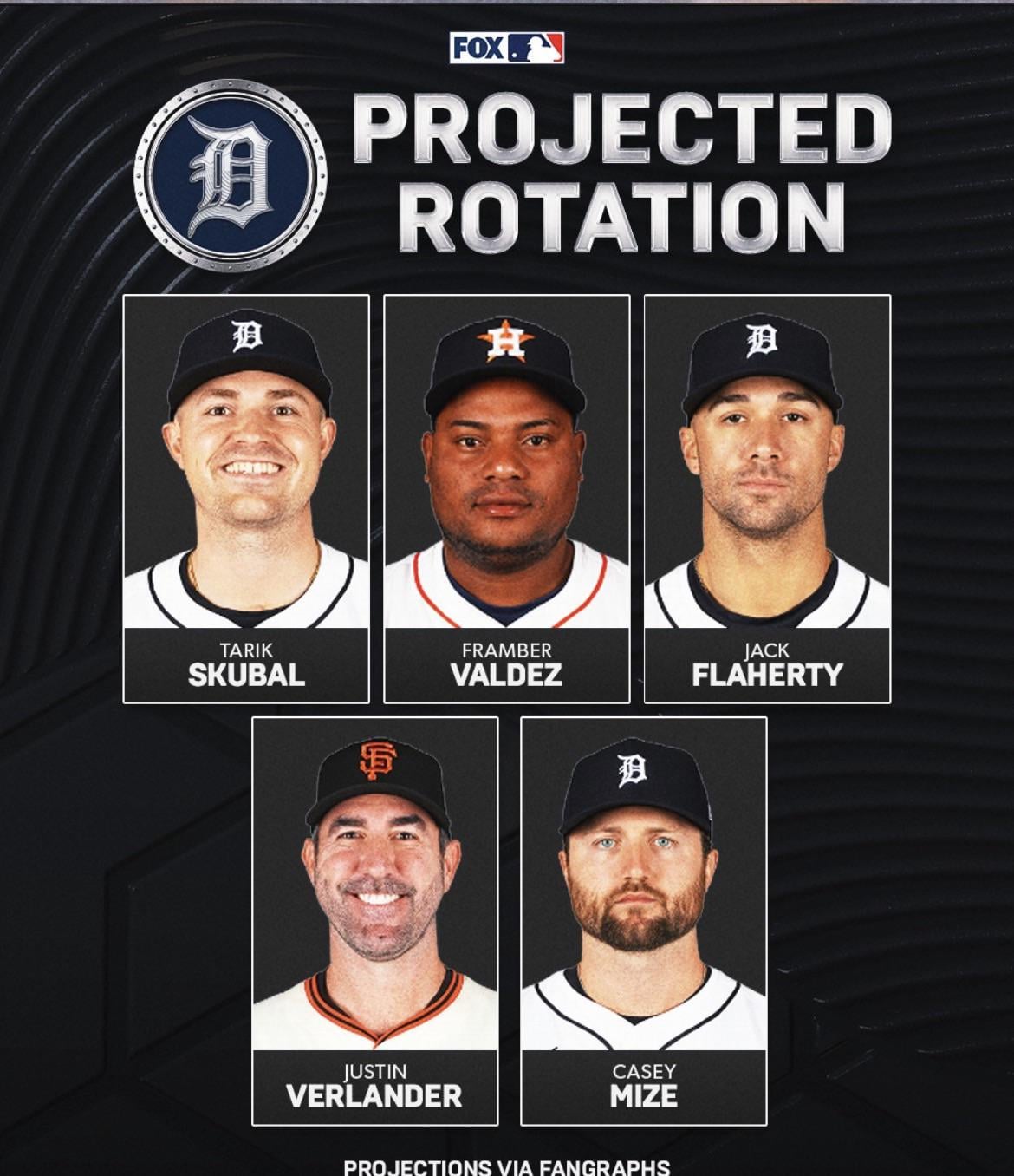 Skubal, Valdez, Flarhety, Mize, Verlander 5 innings/Melton close. I could see Montero in a long relief role. I think the club is not expecting anything from Olson or Jobe until 2nd half. So really they are great insurance pieces if we lose an arm in the rotation.