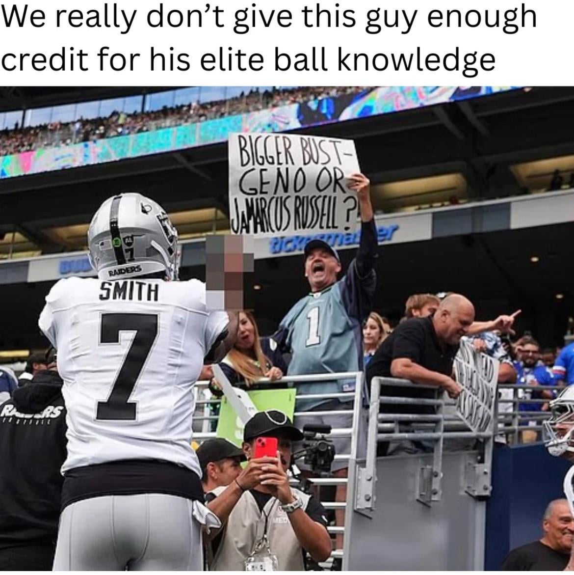 This has been posted so many times. Dude with the sign is just a troll, last time we played at Seattle his sign fired up Jacobs and Jacobs went off for 280 yards. Fuck that dude, he’s a jackass, but even a broken clock is right twice a day.