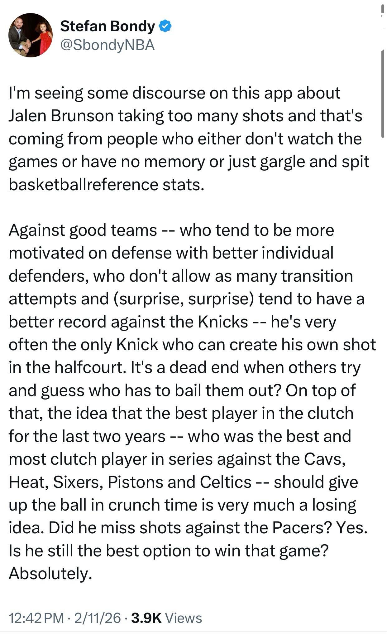 Well his opinion is wrong. I’ve seen this team win many games when other people touch the ball down the stretch. KAT in Detroit ? Mikal in Boston ? KAT in Indiana ? Josh in Philly ? To take the ball up the court and it never touches anyone else’s hand is not the best play for the Knicks in 2026. Brunson 100% should pass and find the ball back on a hand off or catch and shoot minimum. Should not be 3 possessions in a row where no one else gets a touch. That would make the defense cold and players just watching on offense. It’s not good basketball.