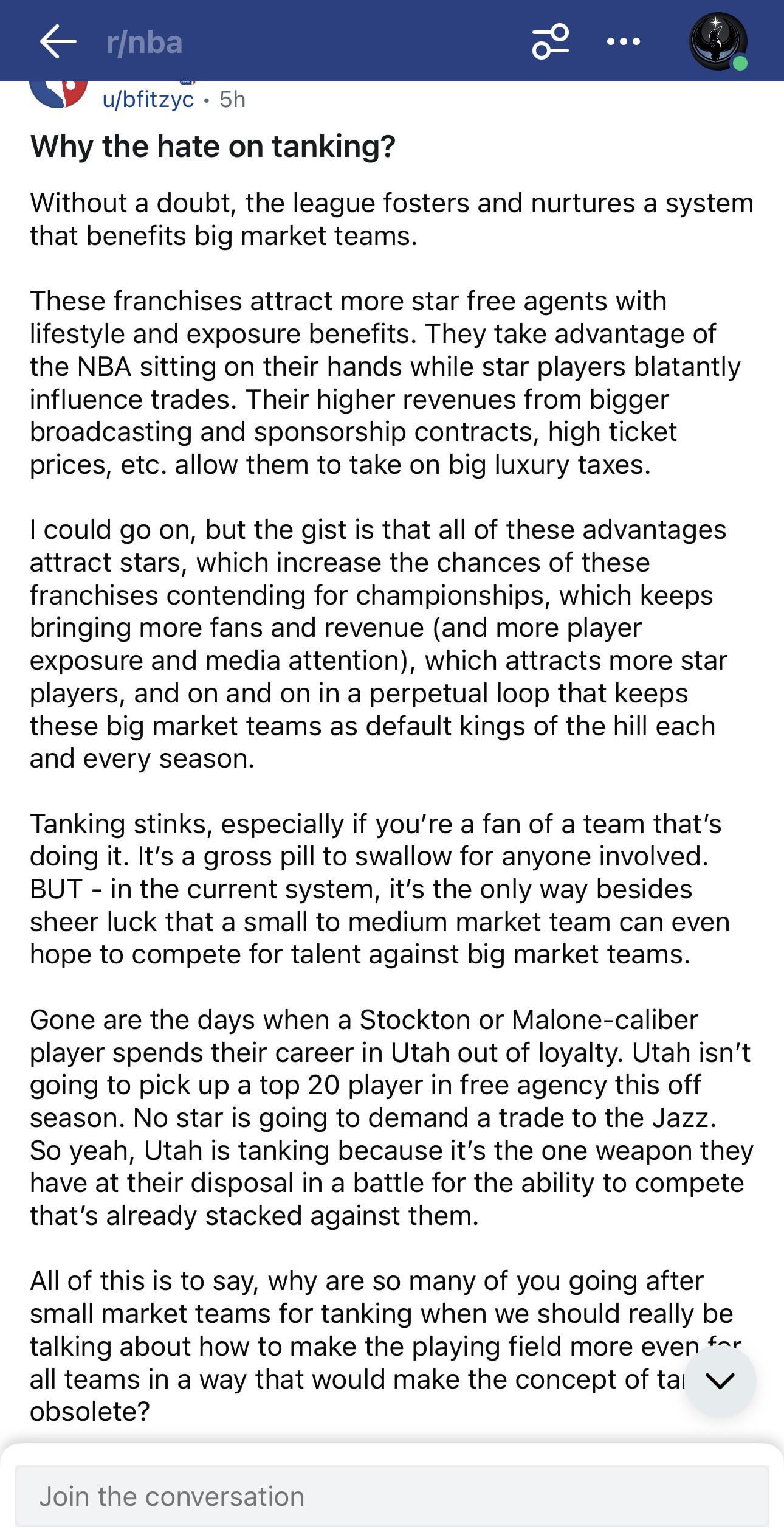 This post just got removed from r/nba subreddit, probably for getting downvoted to the depths of hell. Mind you, for no other reason than suggesting that tanking is a symptom of the unfair advantages possessed by big market teams.