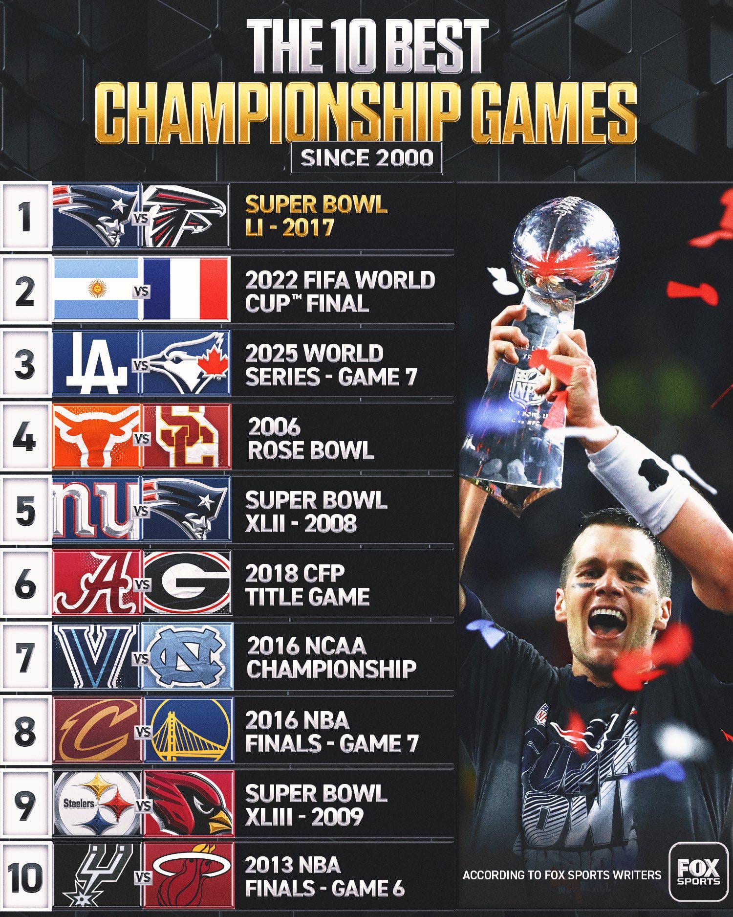 Cubs Game 7 should be #1 on here and the Patriots vs Falcons Super Bowl should be replaced with Patriots vs Seahawks 2014