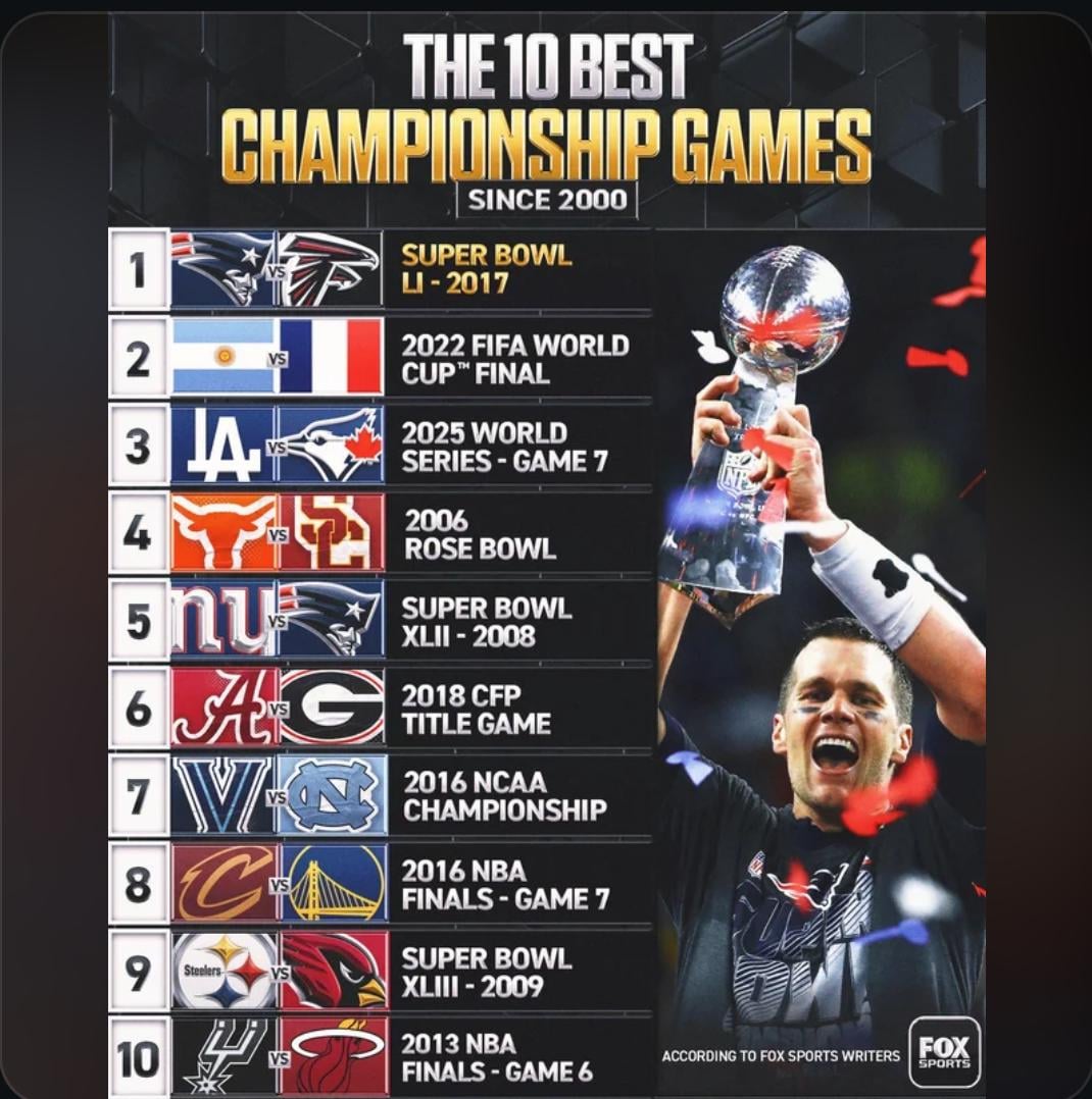 2016 nba finals was absolute cinema, if I weren’t a pats fan that would be #1 for me.