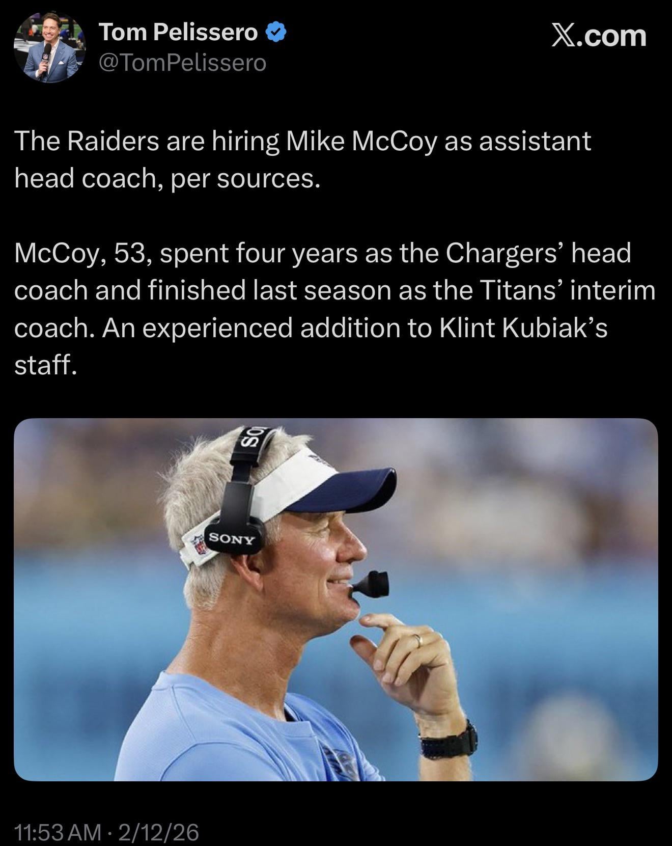 McCoy was former quarterback in college, the NFL, & the CFL. He has been coaching in the league since 2000 & brings a level of experienced offensive expertise. Bringing him onto the staff as the assistant head coach is a good move. A second set of eyes is always a positive. He also worked with Klint Kubiak in Denver in 2017, so the relationship is there.