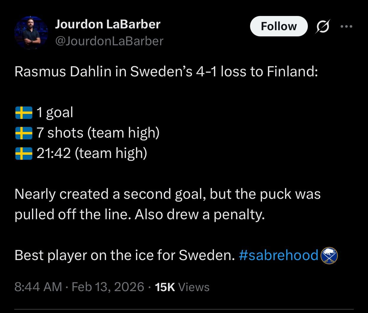 [ Jourdon LaBarber] Rasmus Dahlin in Sweden’s 4-1 loss to Finland: 1 goal, 7 shots (team high), 21:42 (team high). Nearly created a second goal, but the puck was pulled off the line. Also drew a penalty. Best player on the ice for Sweden