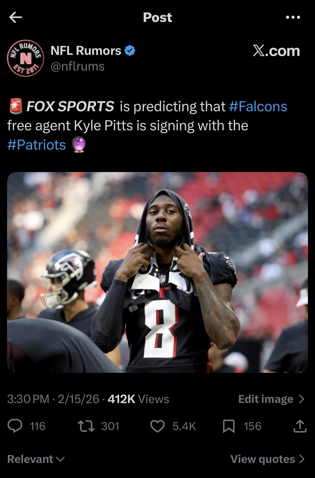 Based on that account every FA TE is signing with the Patriots. Can we have a rule about only posting stuff from credible sources? Like if Fox Sports is predicting that then post a link to where Fox Sports is predicting it.