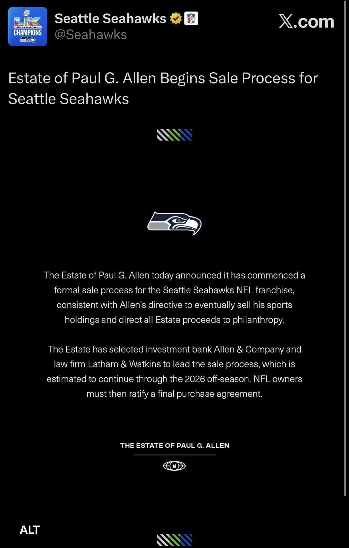 [Seattle Seahawks] Estate of Paul G. Allen Begins Sale Process for Seattle Seahawks