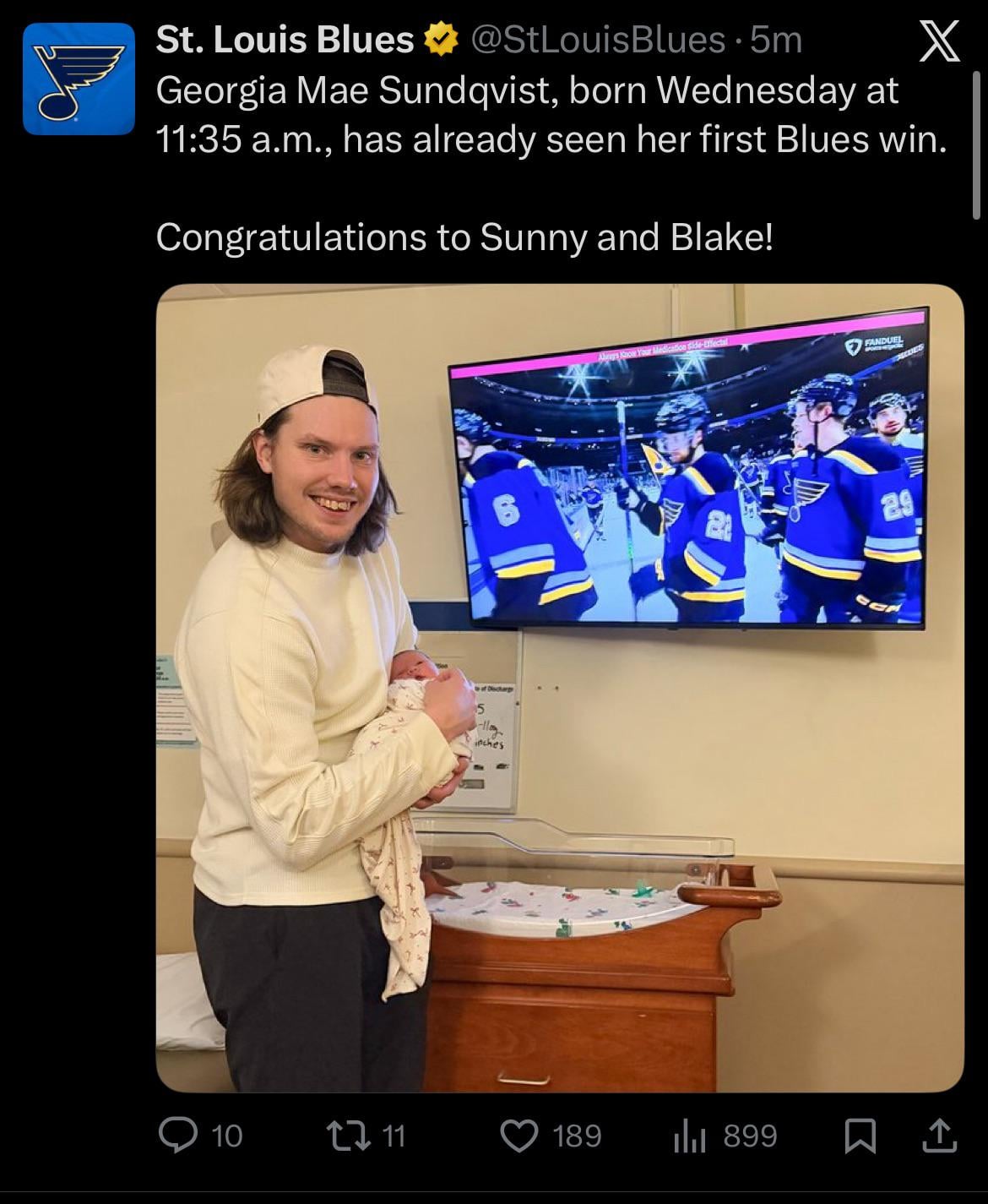 Congrats to Sunny and his wife, Blake, on the birth of their daughter, Georgia Mae! 5 comments Hopefully she gets mom’s teeth 🙂 I’d buy this man a war helmet if I could. God bless him. He’s one of my all time favorite Blues What a beautiful name! That smile… that damned smile. God I hope he stands in STL after his playing days are over. Put him in alumni relations, make him team mascot alongside Barkley, I don’t care. Leave a ReplyYou must be logged in to post a comment.