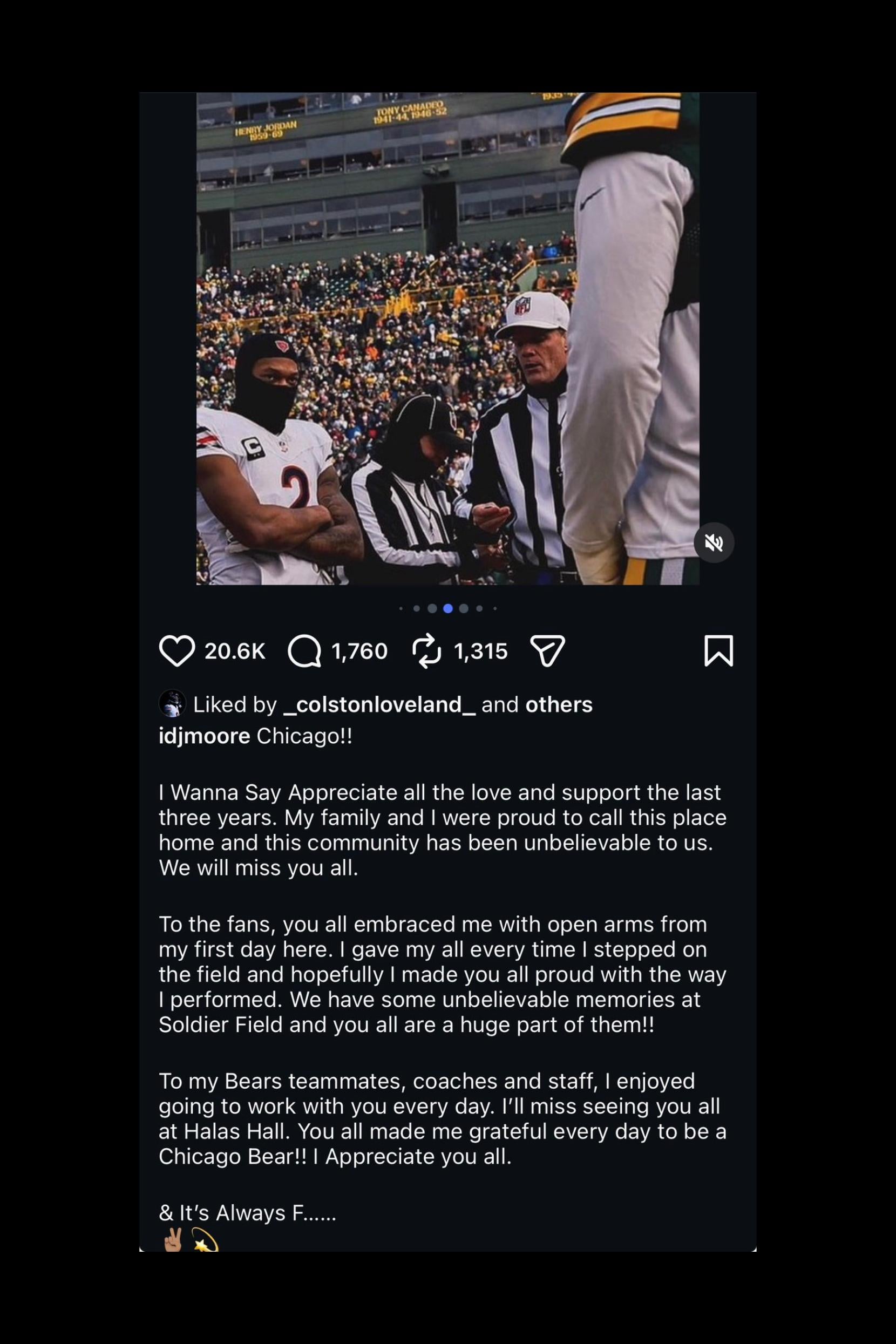 DJ Moore says goodbye to Chicago via IG – “& It’s always F……”