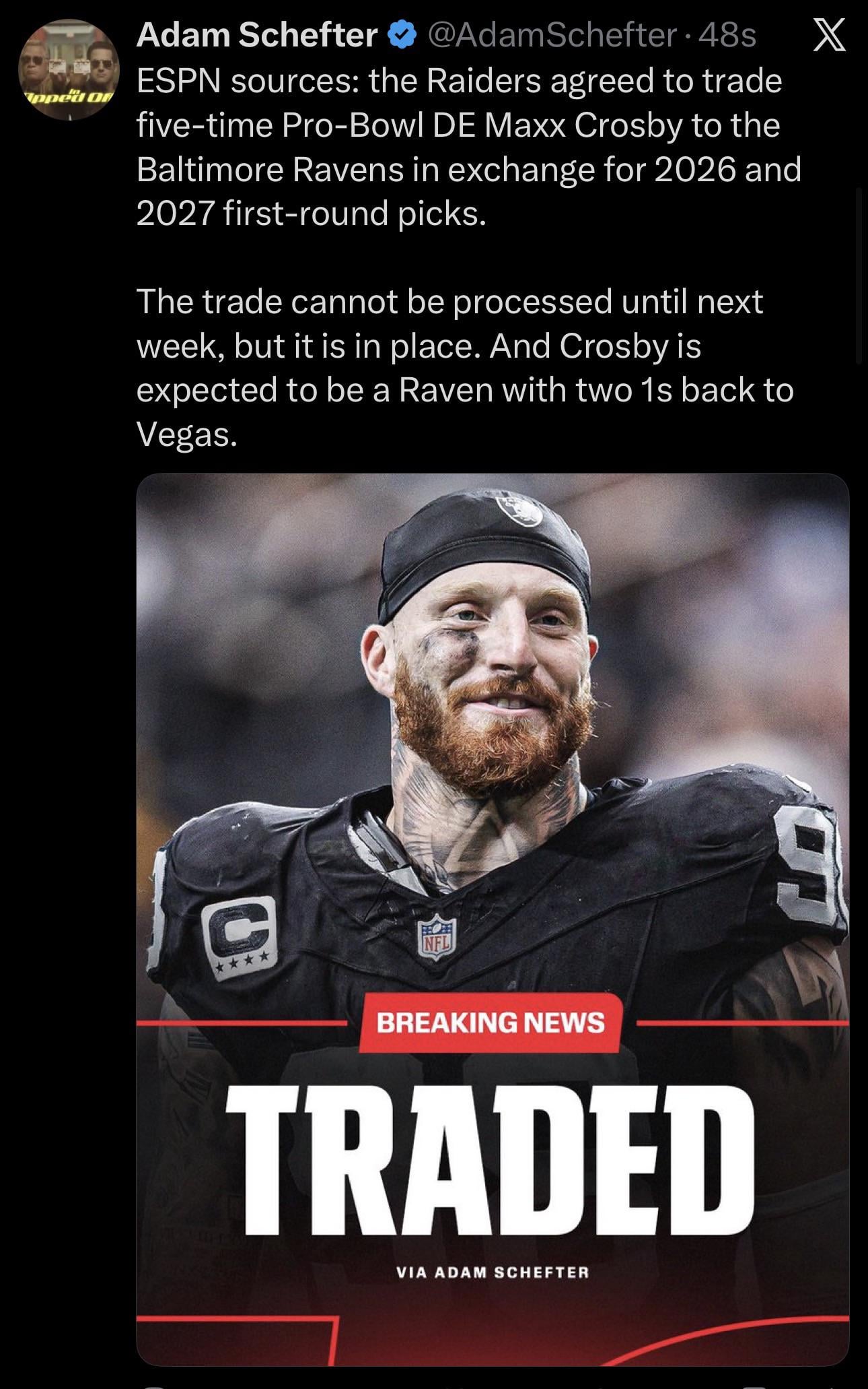 I feel like in the minority because I’m not upset about this. I honestly really like that the ravens gave up two firsts. Maxx is a great player no doubt but he’s already 28, has a $35M cap hit, and while I’m not super knowledgeable about the ravens, I feel like they need their first round picks these next two years (for OL DT and WR?). I do acknowledge that they filled a huge need though which is not ideal.