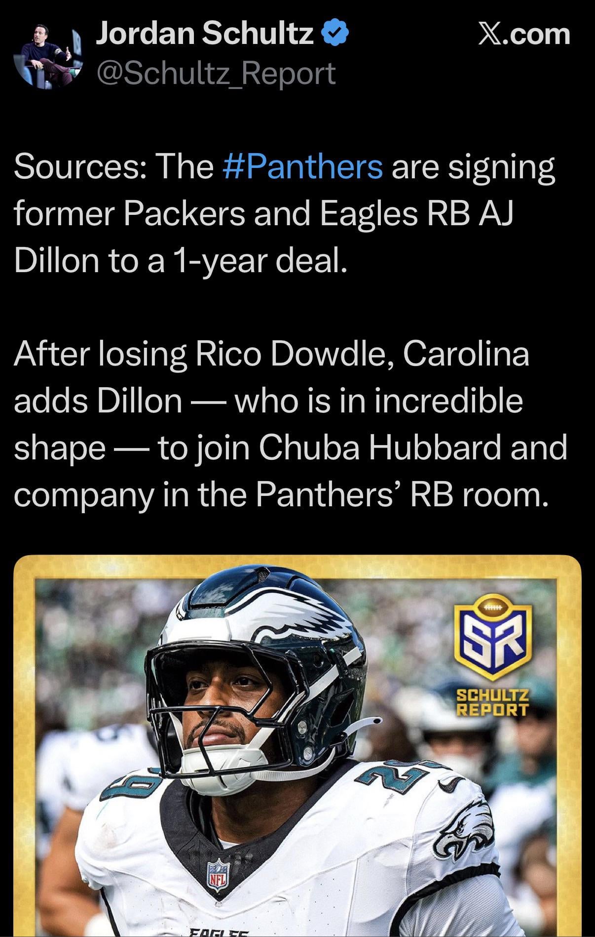 [Schultz] QUADZILLA! Sources: The #Panthers are signing former Packers and Eagles RB AJ Dillon to a 1-year deal.
