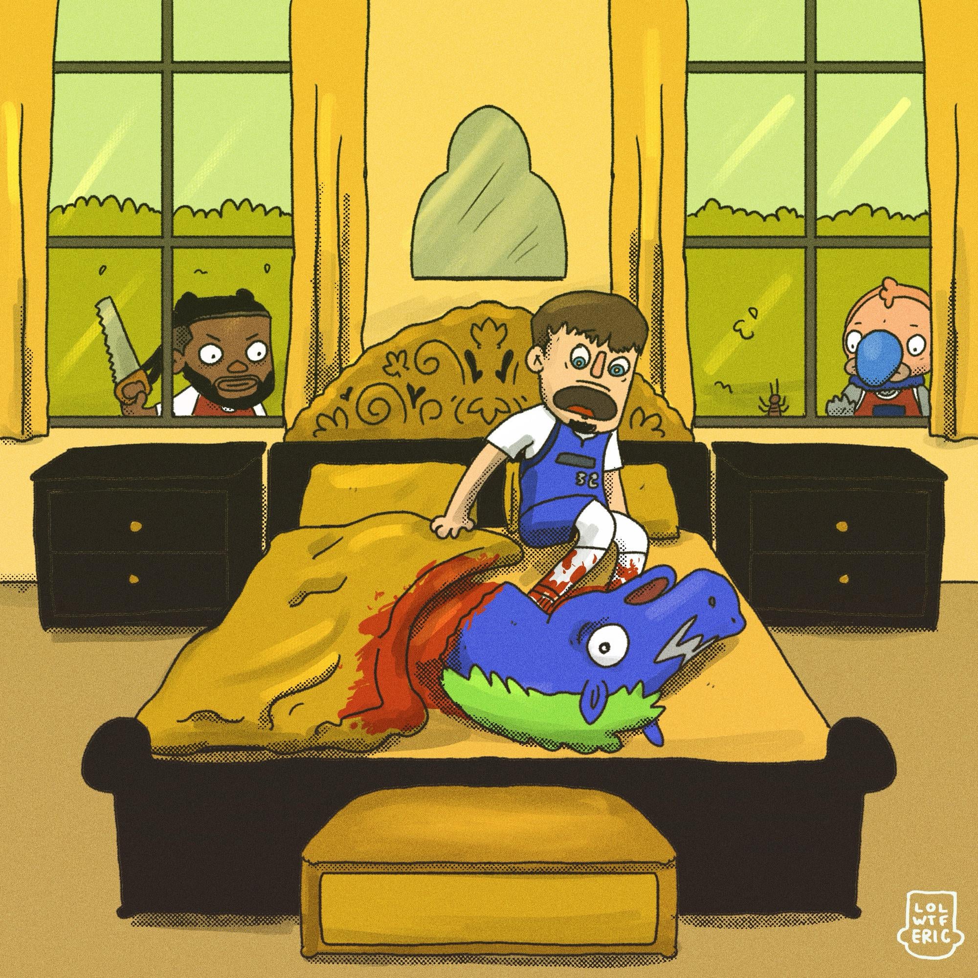 clippers… win?!? 25 comments Shhhhh 🐴🔫 Love being so early, clever as always why isn’t Kawhi pictured? Is that Khartoum??? 🤣🤣🤣 We really beat a dead horse Sweet dreams rook.  Bro that’s foul D: when did we start murdering other teams mascots. Holy fuck this is genius Omg brilliant. GOAT movie Darius…put the axe down! Damn LOL only us old ones get that reference 🤣 Perfect play on The Godfather. Bravo! God I love this content Love how Chuck is all business while DG’s on his Tommy in Casino type shit Cooper was cooking in the first half. Not knowing it was horse meat buahaahaha Your magnum opus! Mavs fan here. I love this. Might rewatch the Godfather soon 🙂 One of your finest, Eric. Darius “Luca Brasi” Garland. Insane referee 🔥 This is top 5 all-timer for me man. Amazing. From one cinephile to another, I always love your movie references. The attention to detail is so good. Coloring is spot on. Honestly one of your best Hang it in the louvre Can’t wait for the hardcover….i know it’s Clippers Lose, but we’re gonna get some of the wins in there too, right lolwtferic?? Leave a ReplyYou must be logged in to post a comment.