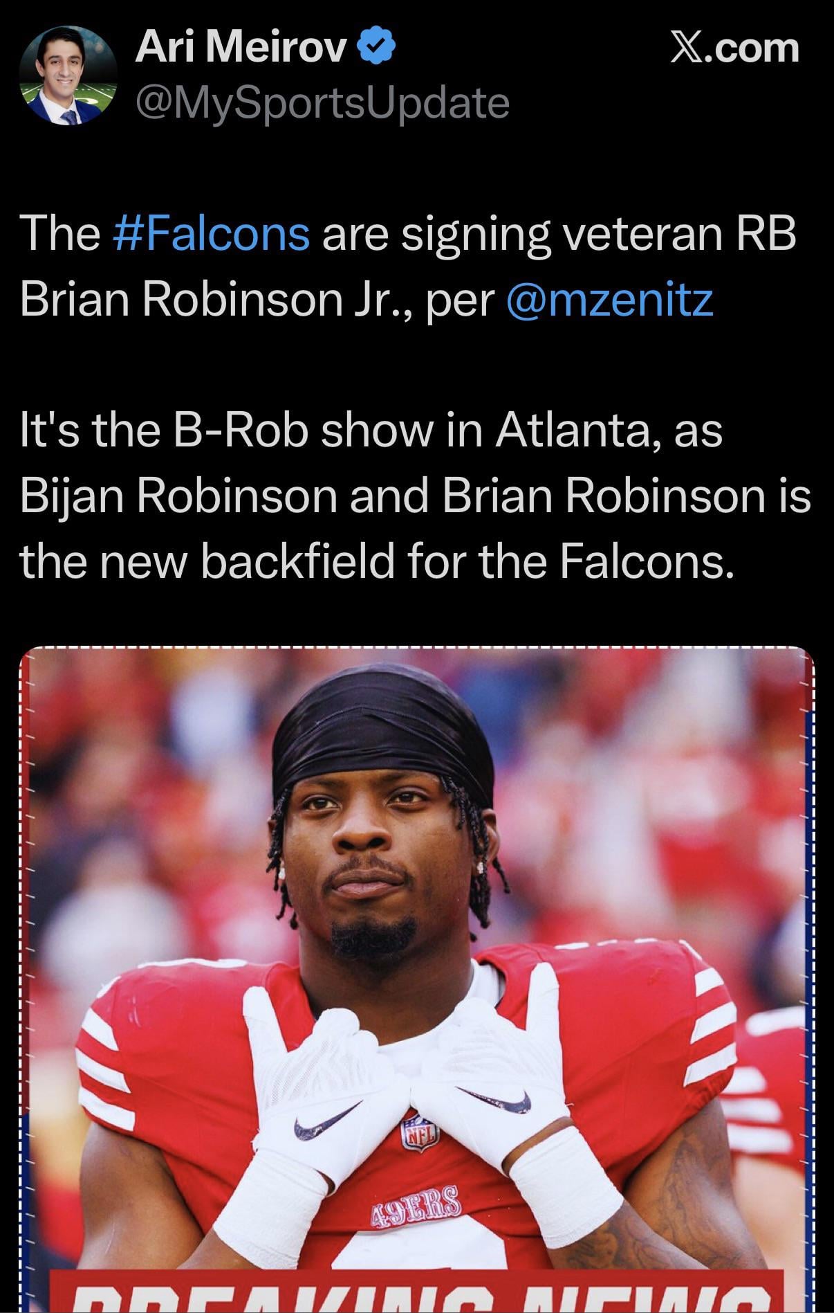 [Meirov] The Falcons are signing veteran RB Brian Robinson Jr.