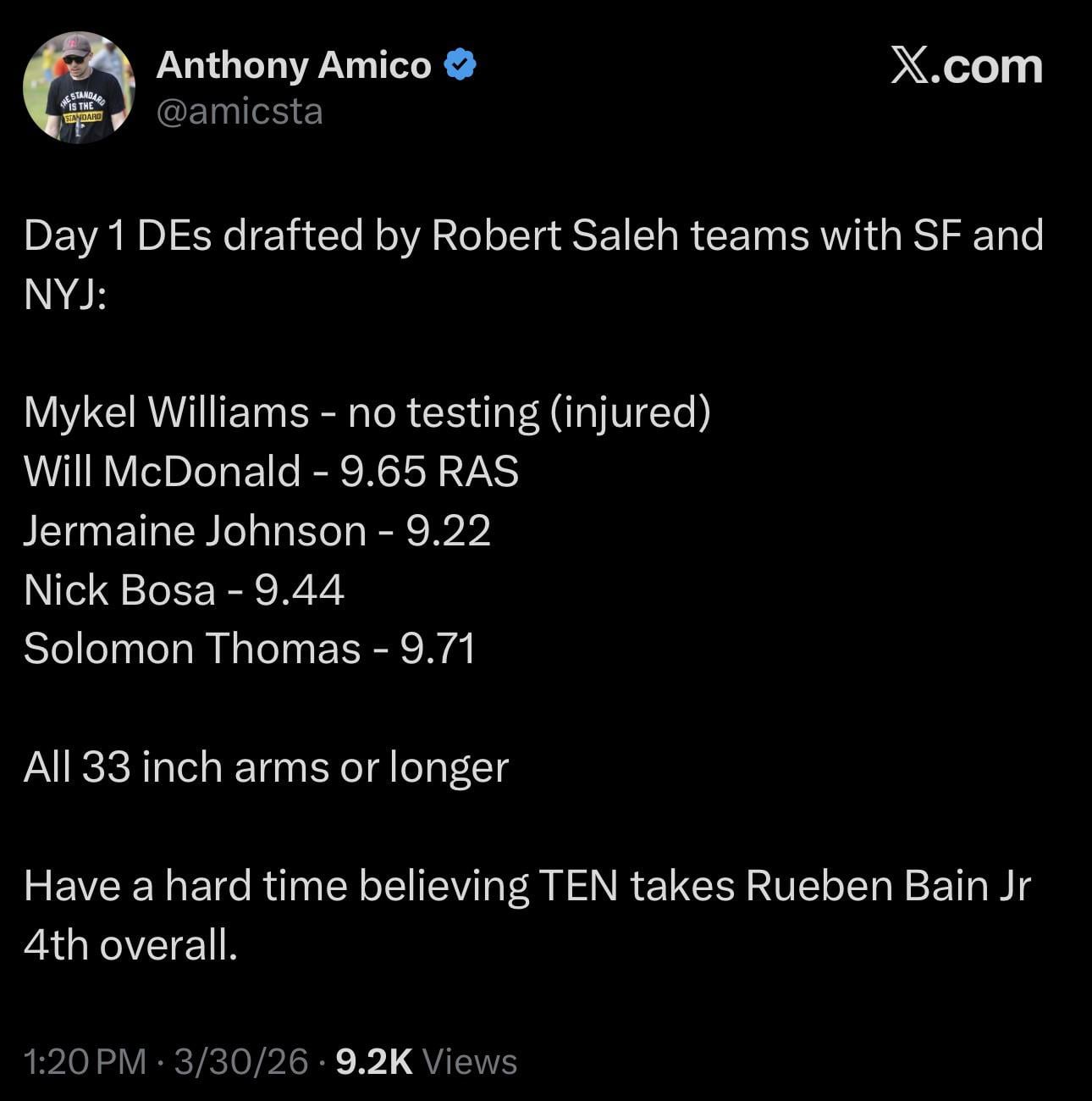 I think its Bain or Bailey or trade down. Regardless of the arm size, look at the RAS. The man really tweeted a post on RAS instead of arm length.