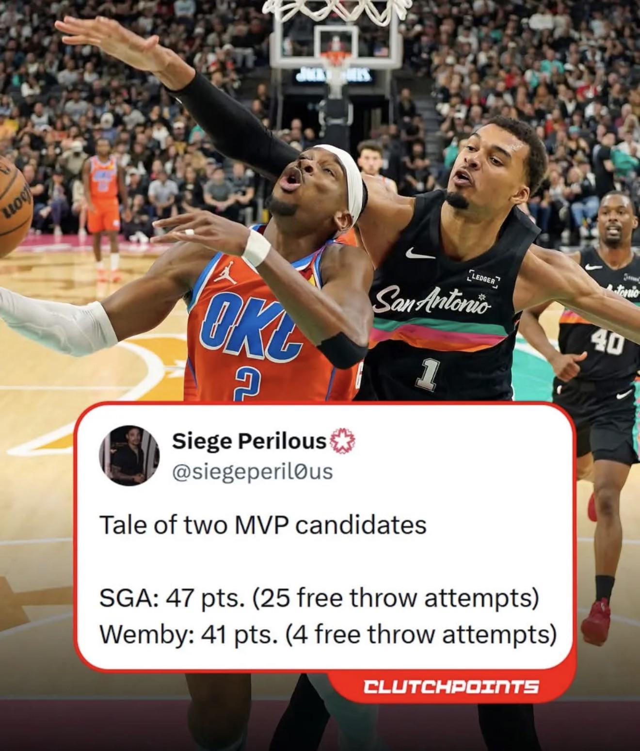 Last 5 games Wembanyama has 23 FT attempts while SGA has had 68 (25 of those last night)