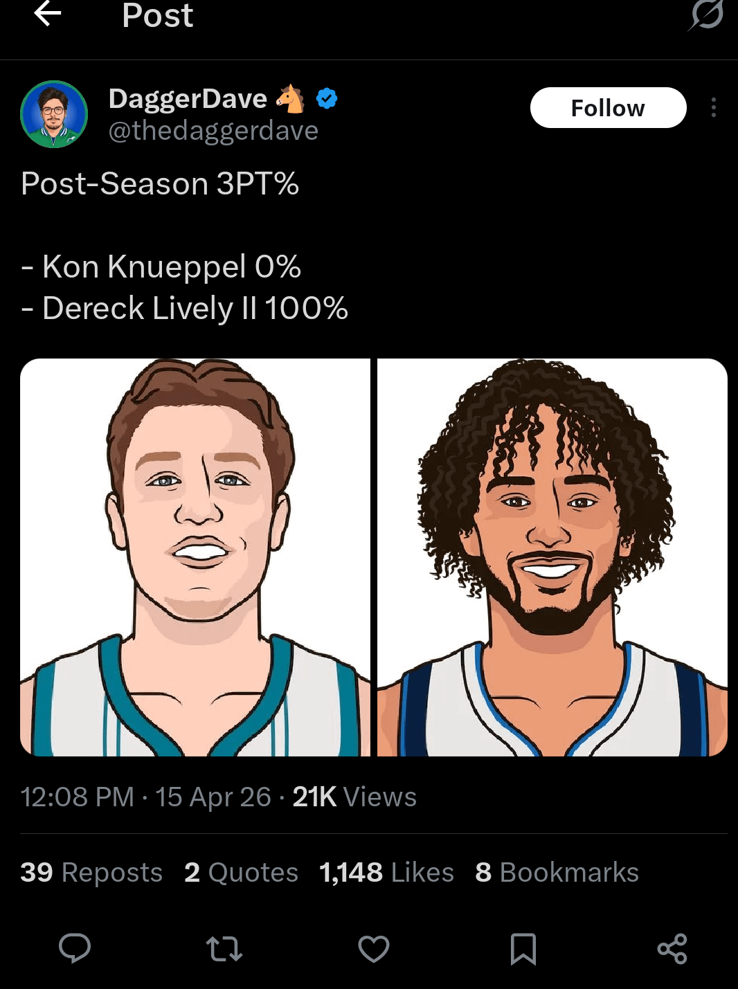 Lively hit his 3 and now he’s the most efficient shooter in postseason history (1 for 1). Peak stats manipulation but I’m here for it. Kid has a real future in this league