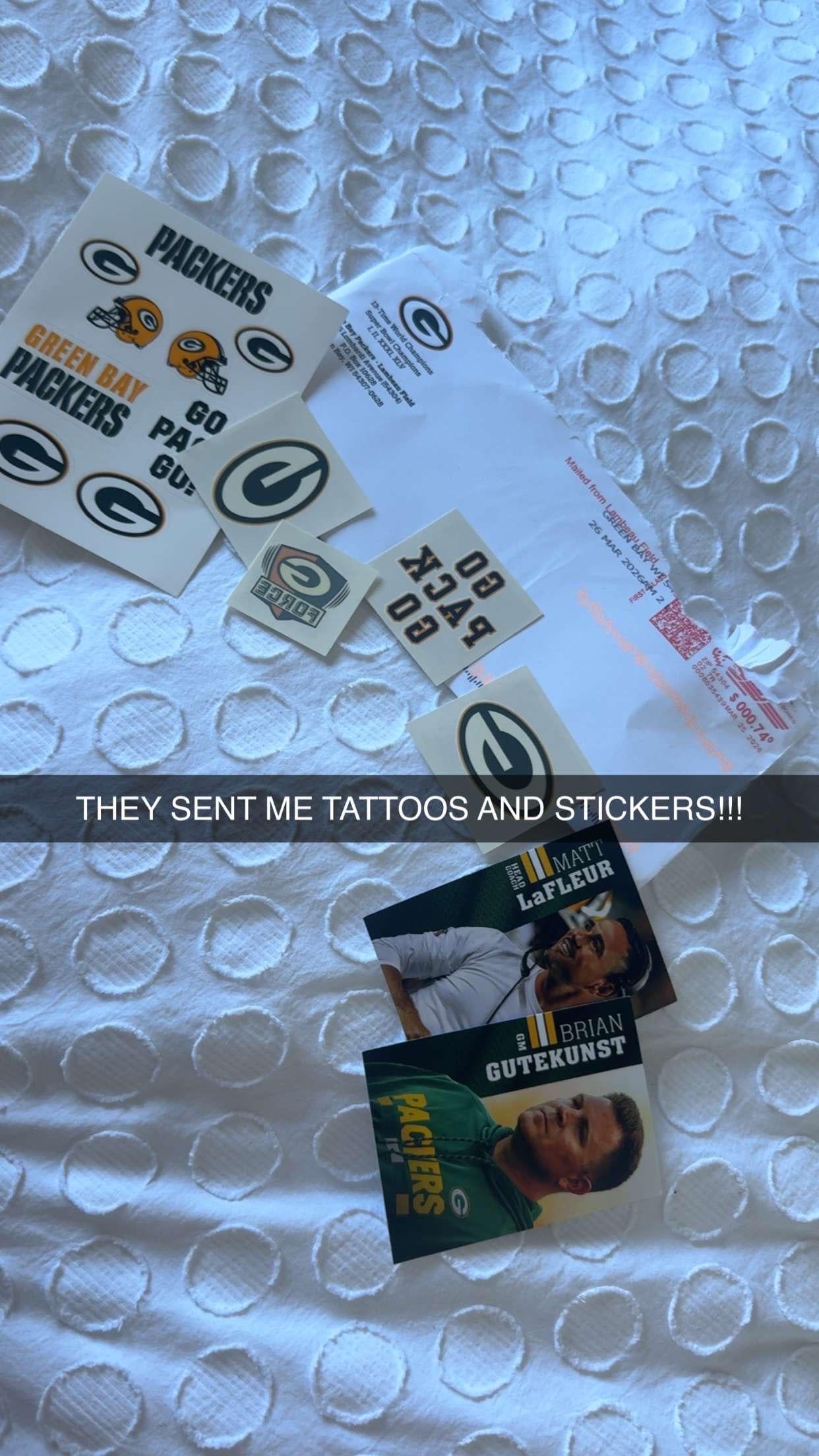 a few months ago i emailed asking if packers perks would ever be extended to other countries, today in the mail i got stickers and tattoos and a letter from customer service, unfortunately no packers perks soon for me! But i’m so happy as a girl in the Uk it’s so hard to get any sort of merch or perks as a fan 🙂
