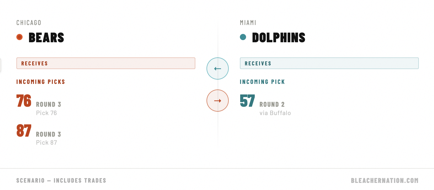 In this mock, Chicago trades No. 57 (the pick acquired from Buffalo in the DJ Moore deal this spring) to Miami in a move that nets the Bears No. 75 and No. 87. Their own second-rounder, No. 60, is where they take a swing at a long-term answer at left tackle.
