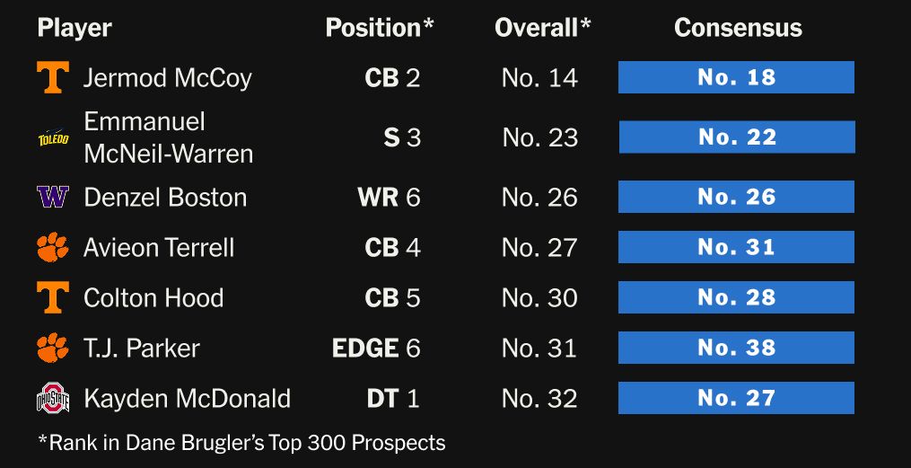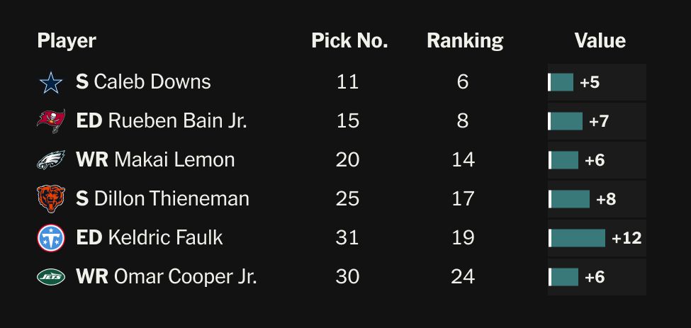 As for Philadelphia, the Eagles got even better value. When my colleague Mike Sando polled execs about Lemon at the combine, one suggested he could go No. 5 to the Giants. But the Eagles traded up to No. 20 for their latest draft-day steal, getting him six spots below his consensus No. 14 ranking.