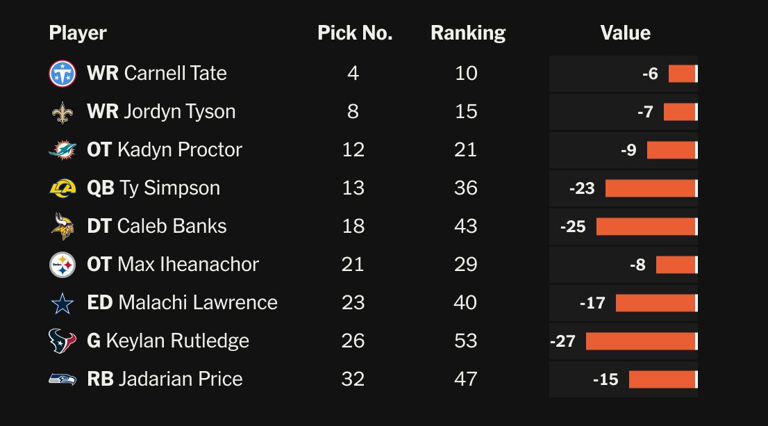 Simpson wasn’t the first round’s only risk. He wasn’t even the biggest reach, at least according to groupthink. That honor goes to the Texans’ Keylan Rutledge, a Georgia Tech guard they traded up to draft 27 spots before the consensus.