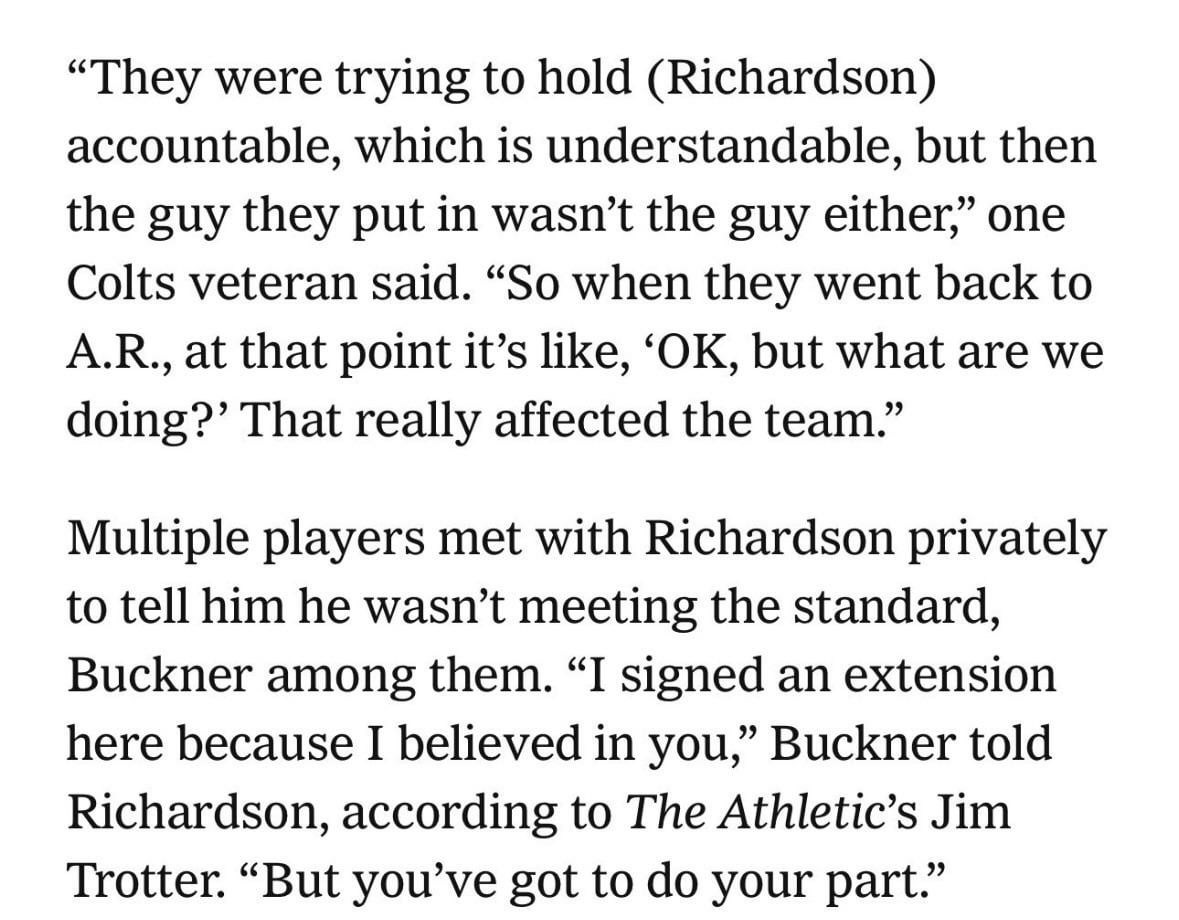 Also, in the article it states Richardson really took that advice to heart and changed his preparation . He’s a talented and a good kid, but he didn’t know how to prepare as an NFL QB. He did the bare minimum and that isn’t enough. Only one year as a starter in college would do that. He should have stayed in college. He’s been stepping it up as of late, however, that may not be enough. We’ll see next season.