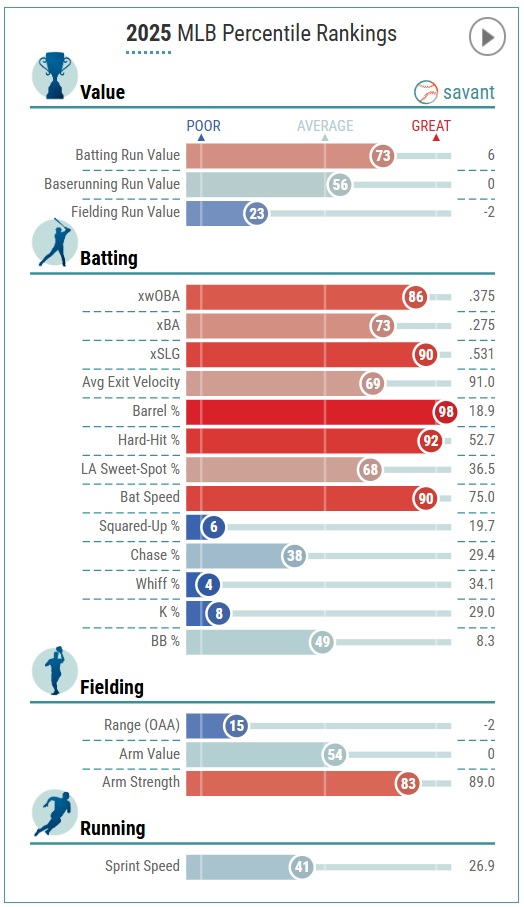 In 2024, before being traded to Miami, he was batting .306 in 19 games and showed signs of regaining form. Now in 2025, he’s played in 60+ games without any known physical limitations, and his 98th percentile barrel rate suggests full health and bat speed recovery.