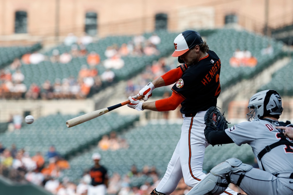 Shortstop Gunnar Henderson singles for one of three Orioles hits in seven innings against Tigers ace Tarik Skubal. (Terrance Williams/AP)