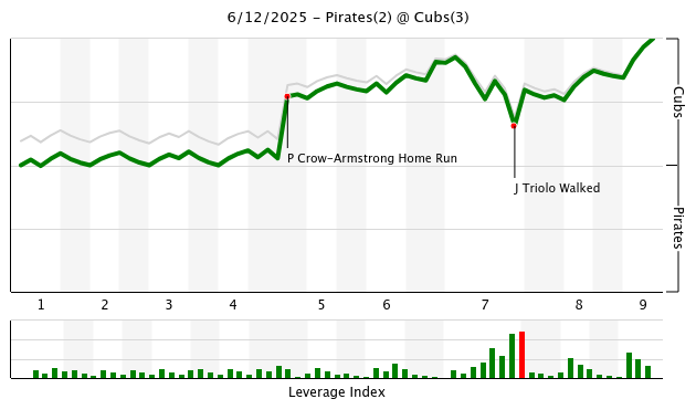 Daniel Palencia and Ryan Pressly slammed the door to notch another win for the Cubs. I love what Craig Counsell did. He used Palencia, presently the Cubs’ best reliever, against the Pirates’ best hitter the last time through. I had hoped that he would consider using Palencia this way once Porter Hodge gets back. Or alternatively, that Hodge would be used that way. Pressly can close. I love the way the last two relievers were deployed. Maybe it would have worked the other way too. But there’s no question this worked this time.