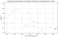 The earned run average and the number of opposing hitters struck out of each MLB team’s pitchers through June 13, 2025. Data courtesy of fangraphs.com. Plot created using the pybaseball scraping tool. (Michael Braithwaite / The Denver Gazette)