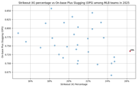 The strikeout percentage and the on-base plus slugging of each MLB team’s hitters through June 13, 2025. Data courtesy of fangraphs.com. Plot created using the pybaseball scraping tool. (Michael Braithwaite / The Denver Gazette)