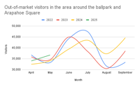 Foot traffic data detailing out-of-market visitors in the area around Coors Field and Arapahoe Square from April through September in 2022, 2023, 2024 and 2025 through June. Data courtesy of the Downtown Denver Partnership. (Michael Braithwaite / The Denver Gazette)