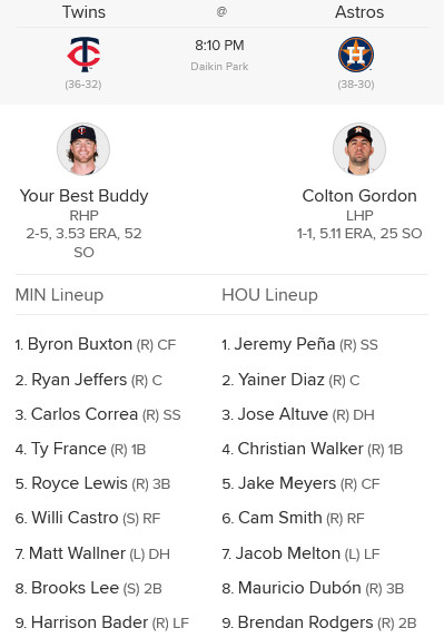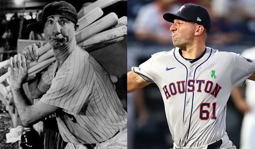 Today’s Astros starter, Colton Gordon, is sadly not Michael Bolton’s son, because then he would have an AWESOME name. He is 26 1⁄2 years old, he throws baseballs lefthanded, and he has pitched in all of five MLB games. So there’s really no sense in sharing his numbers. He’s been very good at AAA last year and this year, with a nice K/BB ratio. He throws a low 90s 4-seamer and sinker, with a slurve/sweeper and occasional curve/change. Here is his MLB.com header image, along with a pic of “Clown Prince of Baseball” Max Patkin: