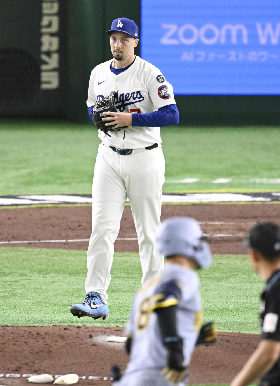 Los Angeles Dodgers pitcher Blake Snell waits as Teruaki Sato of the Hanshin Tigers rounds the bases after hitting a three-run home run in the fourth inning of an exhibition game at Tokyo Dome on March 16, 2025. (Kyodo)