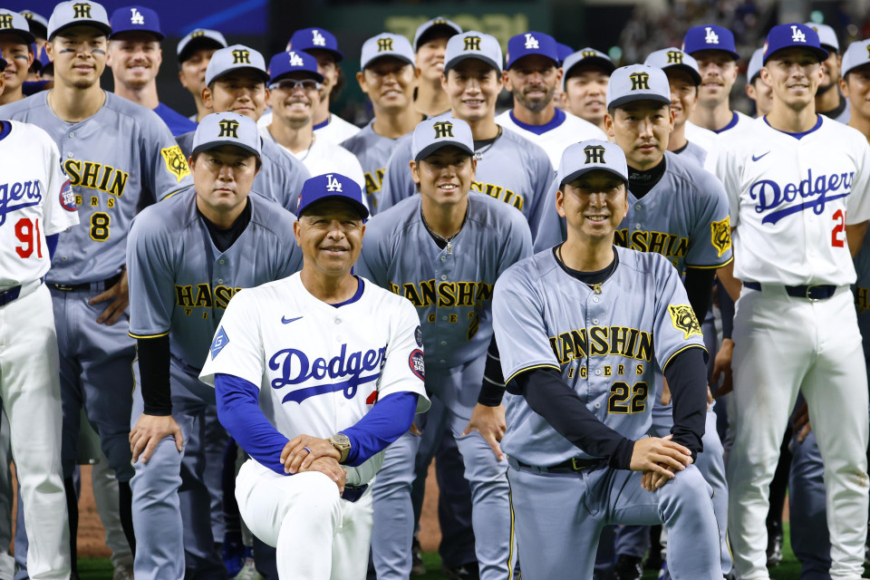 Los Angeles Dodgers manager Dave Roberts (front L), Hanshin Tigers manager Kyuji Fujikawa (front R) and their players pose for a photo after their exhibition game at Tokyo Dome on March 16, 2025. (Kyodo)