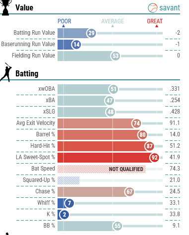 The x-stats indicate that Rodgers’ batting numbers should be higher if luck factors are stripped away. This juxtaposition of actual and expected stats suggest that his future batting stats this year should improve with more neutral luck on his batted balls.