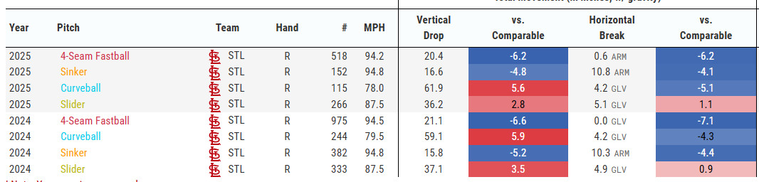 If we wander our eyes to the right-side chart, his pitches don’t seem to have changed shape much between 2024 and 2025. His pitch mix has. More sliders, traded off for less sinkers. His sinker is pretty much a pitch for RH batters only. Will have to explore if the change in pitch mix is more a function of facing more LH batters than anything else. Earlier in the year, I had noted some surprise at how managers were loading their line-ups with LH hitters, which seemed counter-intuitive given his strength in getting LH batters out. Perhaps the LH side of the league’s hitters have caught up with him. Something to look for as we move along.