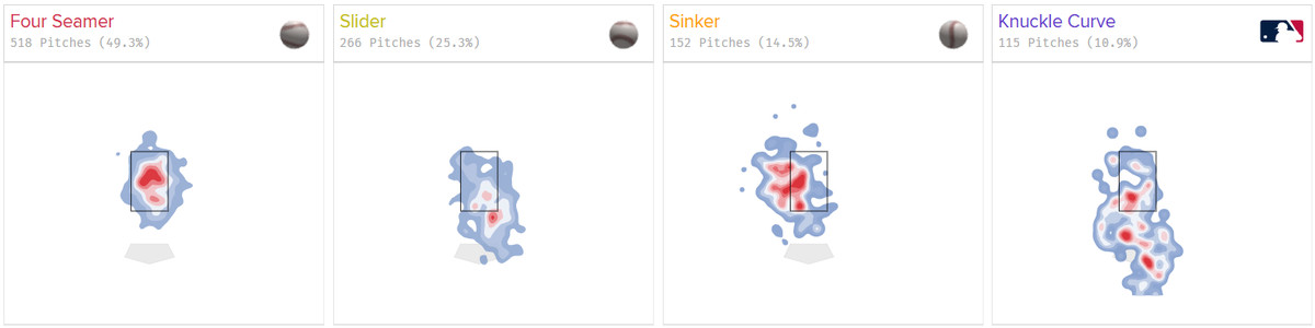 For LH hitters: He is going to attack you with sliders and FB. You will not see the Sinker and if you see a Knuckle-Curve it won’t be a strike. Same advice here. Pitch-time decision between Slider and FB but remember that he throws his straight Fastball 2.5 times more than his slider, so take on the slider should be the default and swing only at the prime pitches. Again, if you as a hitter can pick up spin, the slider is 90 degrees different spin than every other pitch he has. Take, even with 2 strikes. He can’t land that slider in the zone regularly enough to worry about a K. Ergo, the low K rate. Then, wait on his straight FB. It is coming.