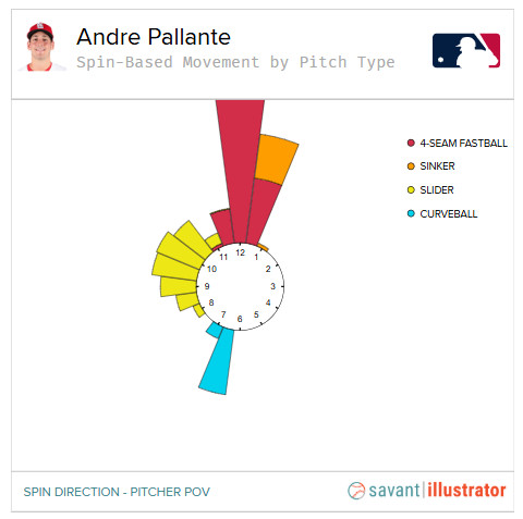Sometimes, you just have to see and experience a pitcher’s stuff a few times to get a good read. Once a hitter has seen Pallante enough times, both LH and RH hitters can recognize and eliminate the Slider from the equation based on an almost 90-degree spin axis difference from him FB. Small wonder than he is losing his LH batter advantage. Good hitters pick this stuff up. Not all do, but good ones do. The Sinker/FB combo is well disguised (not an issue for LH hitters), but the movement profile isn’t that different (see the first chart). Both hop a bit, the sinker runs a bit more. For a RH batter, see the spin and choose location (middle-middle sounds good).