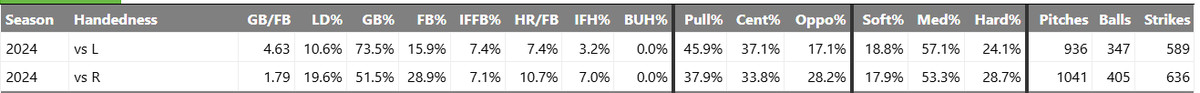 Next thing is hard contact against LH hitters is up 50% (from 24% in 2024 to 35% in 2025). It has not really changed against RH hitters. Without showing you a chart, I can tell you his ISO against LH batters is up .150 points. That is a lot, and is counter to his one elite strength, which was inducing weak, on the ground contact vs. LH hitters. Now, he still has elite ground ball rates, but many of those ground balls are getting smacked 110+ mph, so are turning into less outs. More doubles (and more homers tossed in).