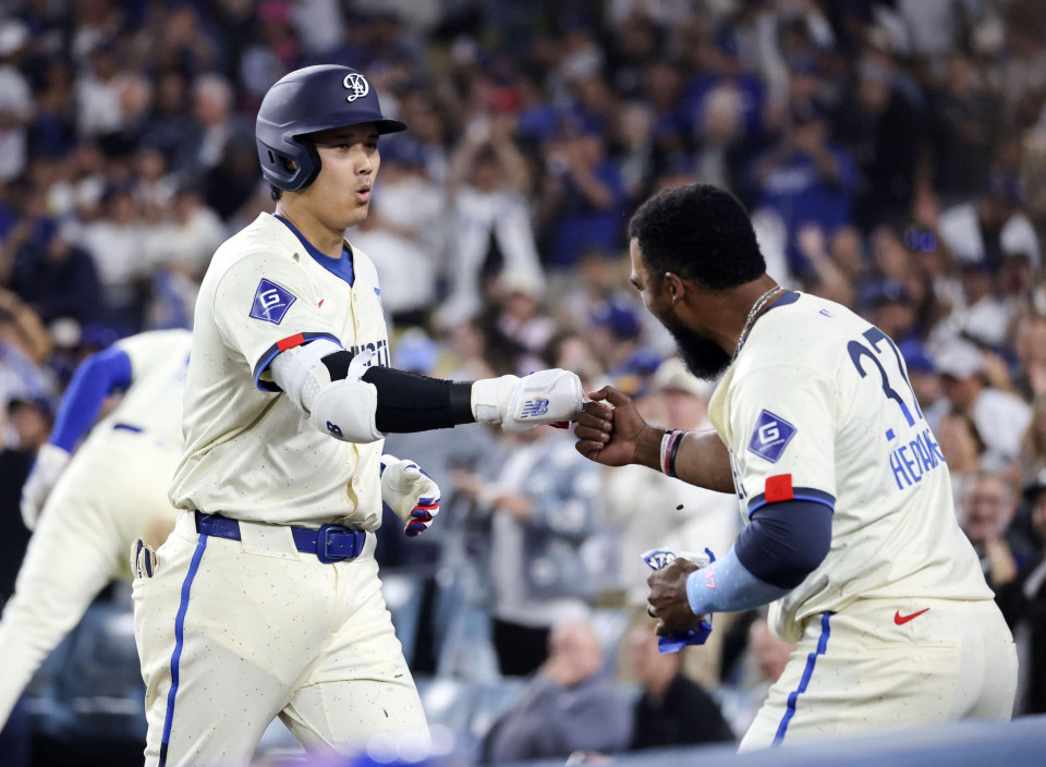 Los Angeles Dodgers designated hitter Shohei Ohtani (L) fist bumps Teoscar Hernandez after hitting a solo home run, his second of the game and 250th in MLB career, in the sixth inning of a baseball game against the San Francisco Giants at Dodger Stadium in Los Angeles on June 14, 2025. (Kyodo) ==Kyodo
