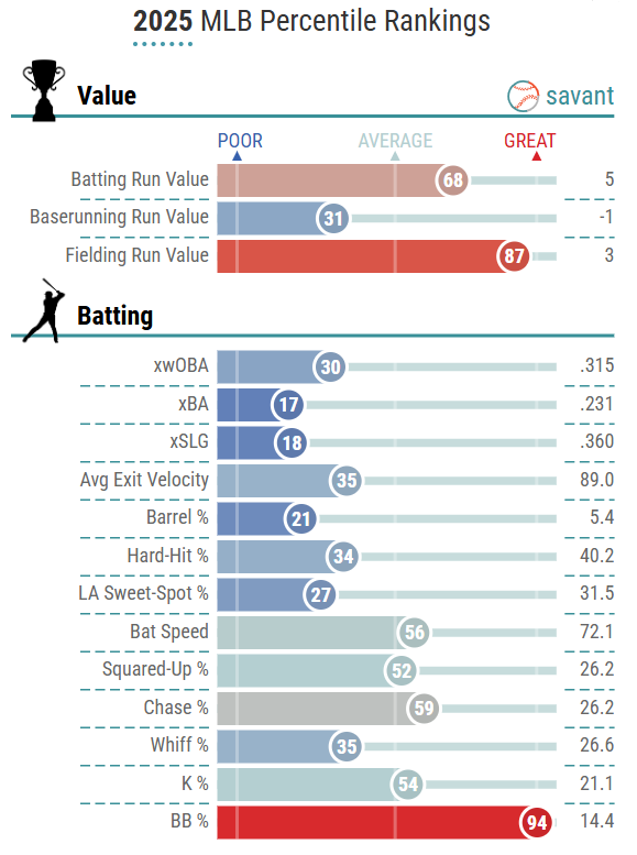 Over the previous three seasons, Contreras’ season average was 20 homers, 72 RBI, 79 runs, and six steals while hitting .283/.363/.472 in 131 games. This year, Contreras has a 131-game pace of 12 home runs, 61 RBI, 70 runs, and 10 stolen bases. Aside from the steals, 2025 is trending towards being a down year.