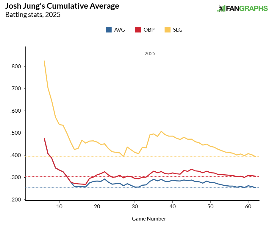Jung has put up solid numbers in his Major League career. The problem has been staying healthy. In 2022, Jung was limited to a total of 57 games in the Minor Leagues and Majors. He then played 122 MLB games in 2023 (homering 23 times) and was again limited in 2024, playing just 53 games at all levels.