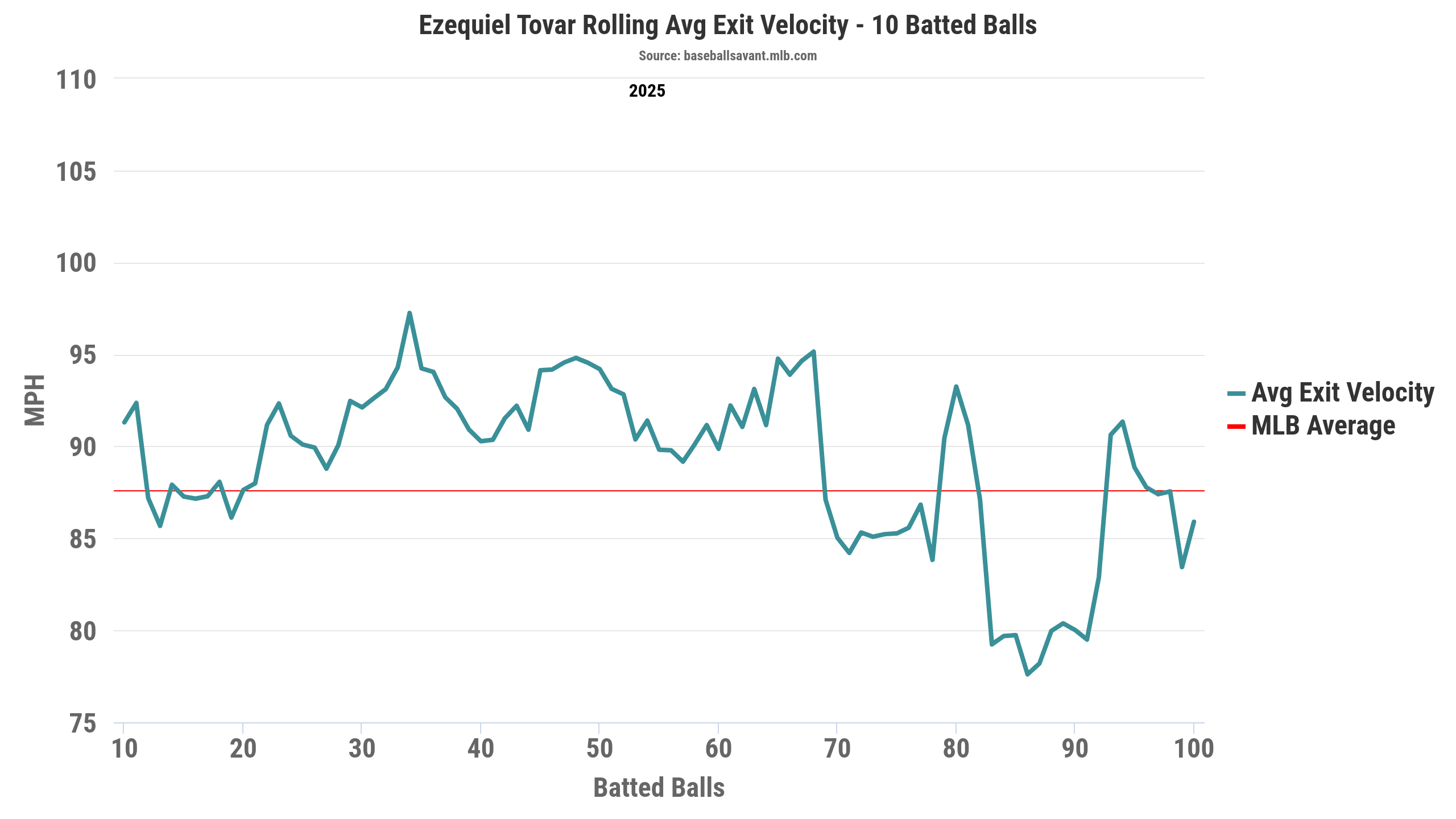 What may not have been so clear is the impact an injury had on Tovar. Prior to going on the IL, he was struggling. Tovar hit .184/.225/.289 in the 10 games before the injury forced him to miss time. If we look at Tovar’s rolling average exit velocity, it began to regress just before landing on the IL.
